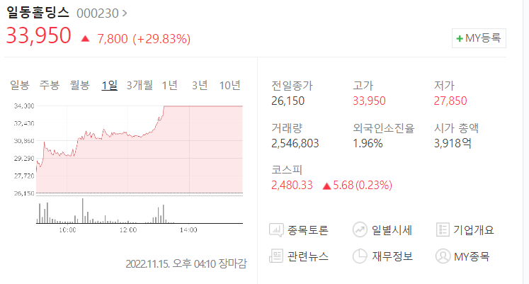 역시 조코바 긴급사용승인 임박의 영향으로 일동제약과 같이 동반 상한가 마감 되었으며 15일 나온 공시에 의하면 일동홀딩스는 300억 규모의 전환사채(cb)발행 공시가 나왔으며 무기명식 무이권부 무보증 사모 전환사채 방식으로 발행 대상은 케이비 제4호 바이오사모 투자조합이라고 합니다