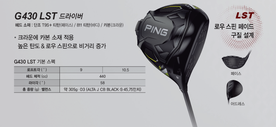 핑G430 드라이버LST는 미국골프협회공인 드라이버 목록에 이름도 올렸으며 미국프로골프(PGA) 투어 슈라이너스 칠드런오픈에서 23명이나 사용을 했다고 한다